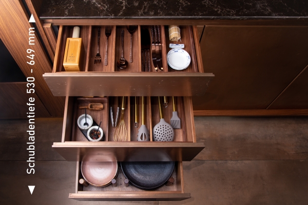 Konfigurieren Sie hier passgenau Ihren Besteck- oder Mehrzweckeinsatz für Schubladen mit einer Innentiefe ab 530 mm. Wählen Sie dazu: