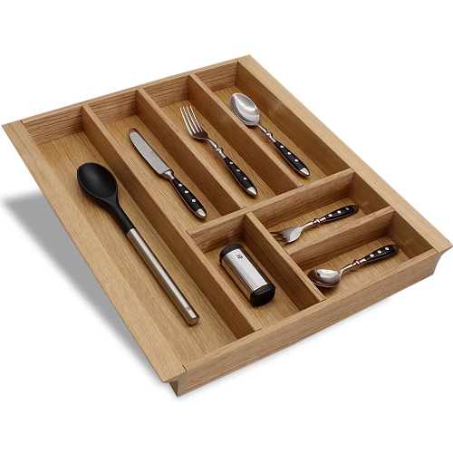 Edler Besteckeinsatz aus Massivholz, hergestellt in eigener Schreinerei, lieferbar für über 60 namhafte Küchenhersteller. Der Besteckkasten besteht aus 9mm starken Massivholz Profilen die gedübelt und verleimt mit einander verbunden werden, einen Echtholz furnierten Boden und 2 Formprofile (für gerade oder schräge Zargen) die den Kasten seitlich passend abschließen. Das verarbeitete Holz stammt aus einer für Nachhaltigkeit zertifizierte Quelle. Der Besteckeinsatz zeichnet sich durch hervorragende Verarbeitung und hohe Funktionalität aus und ist eine Augenweide in jeder Kücheschublade.